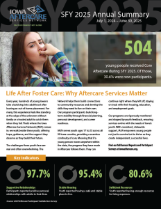 Report includes trend information from intake interviews with youth; demographic and other characteristics of all participants served each year; and outcomes of youth exiting Aftercare services.